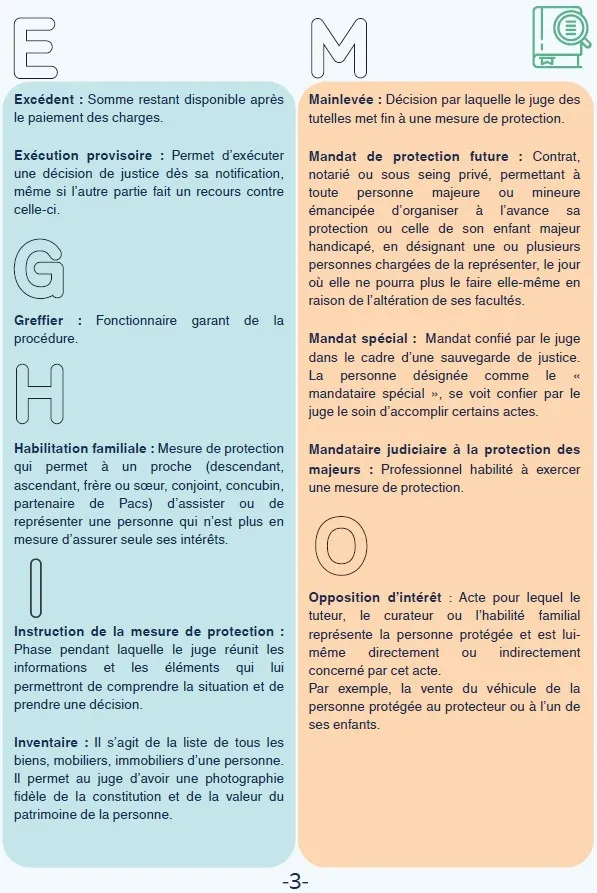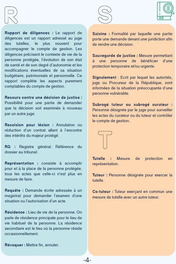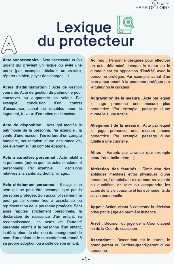Les services d'Information et de soutien aux Tuteurs Familiaux de la région Pays de la Loire (Loire Atlantique, Maine et Loire, Sarthe, Mayenne et Vendée) travaillent en partenariat depuis de nombreuses années. Ce lexique est le fruit de leur collaboration active et vise à expliciter les termes juridiques et techniques régulièrement utilisés dans les jugements, notes d'information remis aux tuteurs familiaux.