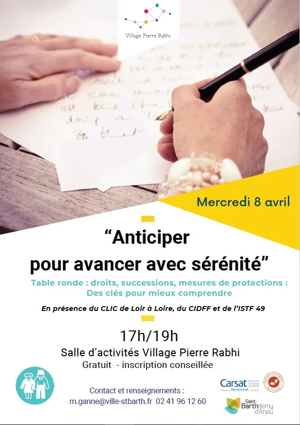 Le CCAS de Saint Barthélémy d'Anjou organise une table ronde le mercredi 8 avril 2026 de 17h à 19h, à la salle d'activités Village Pierre Rabhi. Il y sera question de vos droits, des successions et des mesures de protection.
