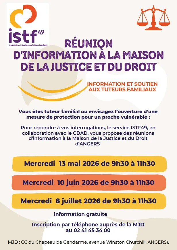 Le service ISTF 49, en collaboration avec le CDAD de Maine et Loire , vous propose une réunion chaque mois au sein de la Maison de la Justice et du Droit d'Angers pour répondre à vos questions. Vous trouverez ci-dessous les prochaines dates prévues.